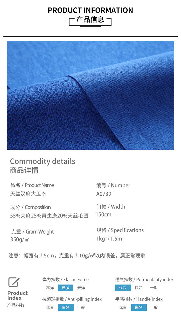 • 成份含量:55%大麻25%再生涤20%天丝毛圈