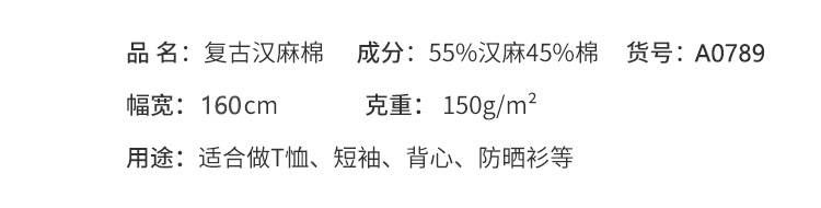 • 成份含量:55%汉麻45%棉